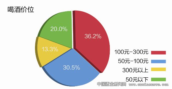 关于酒的价位,新浪河南的调查结果是,50元~100元占30.5%,100元~300元占36.2%,50元以下及300元以上的占比则分别为20.0%、13.3%。九州糖酒网的调查结果是,50元~100元占33.77%,100元~300元占25.97%,50元以下占32.47%,300元以上则只有7.79%。