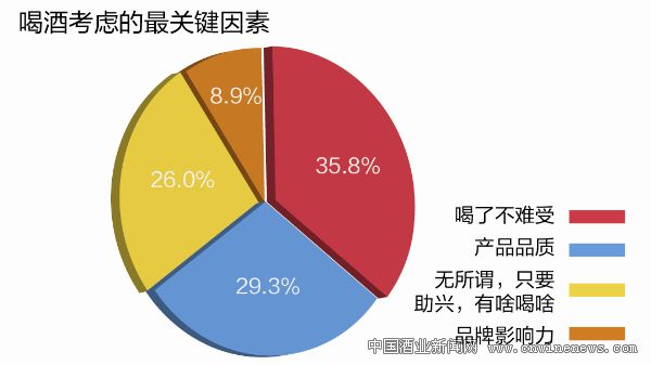 35.8%选择“喝了不难受”,29.3%选择“产品品质”,8.9%选择“品牌影响力”,其余26%则认为“无所谓,只要助兴,有啥喝啥”。这是新浪河南调查的数据。