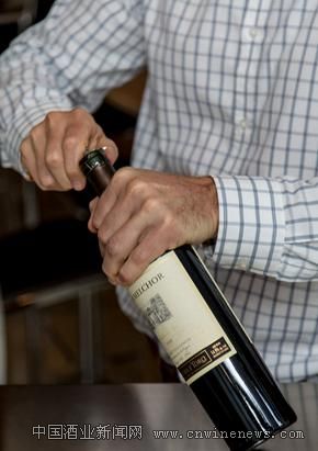 1. 用开瓶器里的小刀沿防漏圈(瓶口凸出的圆圈状的部位)下方划一圈,切除瓶封。(小心手指,以免被锋利的金属膜刮伤。)