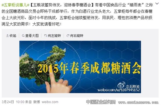 2015春糖会期间,五粮液不仅在线下一展白酒大王风采,而且在线上开展了微博、微信的“双V”联动,用互联网新媒体、新思维造势春糖会,赢得了网友们的热情关注和鼎力支持,营造了五粮液互联网新形象。