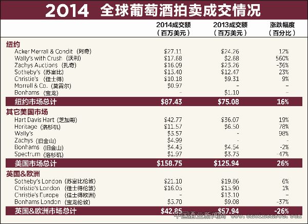 2014年,美国市场葡萄酒拍卖总额上升26%,由2013年的1.26亿美元增长到1.59亿美元。收藏家Roy Welland委托沃利拍卖行进行拍卖的一批佳酿共拍得1100万美元,为这一增长贡献了相当大一部分。由于亚洲买家需求下降,香港市场的拍卖总额下降约7%,为1.04亿美元。