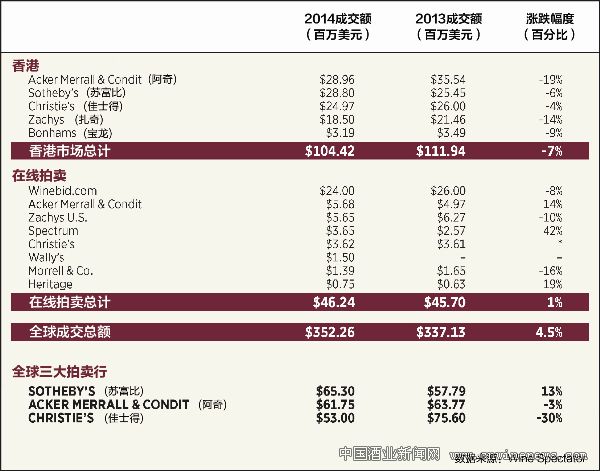 美国《葡萄酒观察家(Wine Spectator)》杂志近日报道,根据全球主要拍卖行的数据,2014年全球葡萄酒拍卖市场终于停止了连续两年的下滑趋势,出现小幅反转,总成交额增长了4.5%,达3.52亿美元。