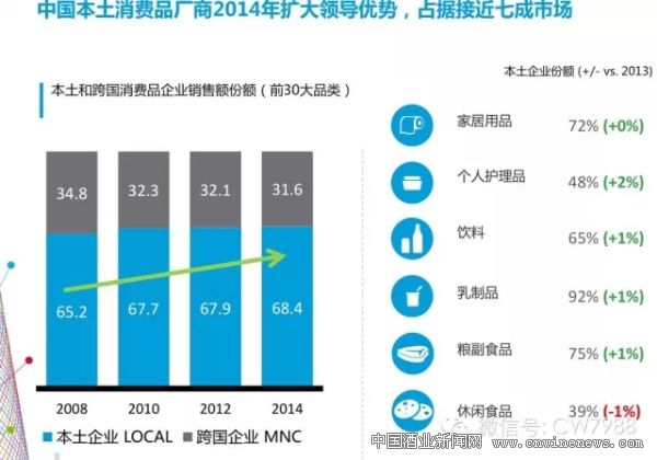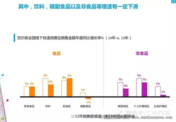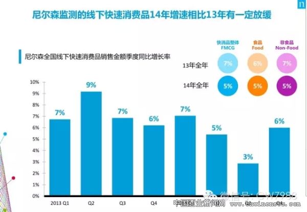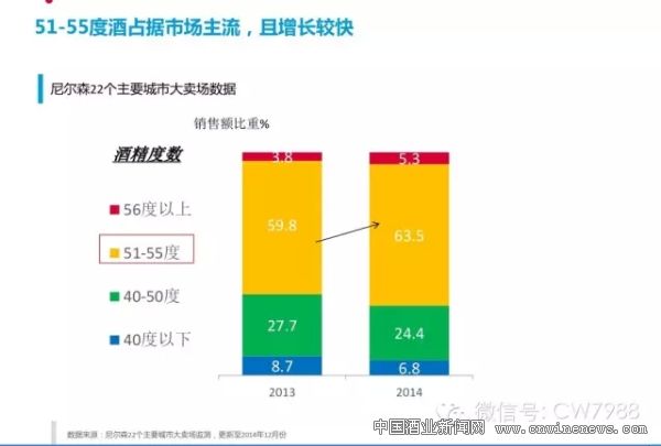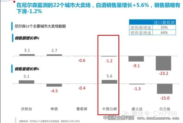 根据尼尔森对全国22个主要城市超过1100家大卖场的监测数据显示,在非餐饮行业,白酒产业发展经历了非理性高速增长,抑制性下滑之后,在2014年明显回暖,2014年白酒销售量较2013年增长了5.5%,而2013年销售量较2012年下滑了2.7%。与其他洋酒、啤酒和葡萄酒品类相比,白酒在销售量上的增长也是独占鳌头,除了伏特加也享受了超过5个百分点的增长之外,其他酒品类销售量增长率均为负数。
