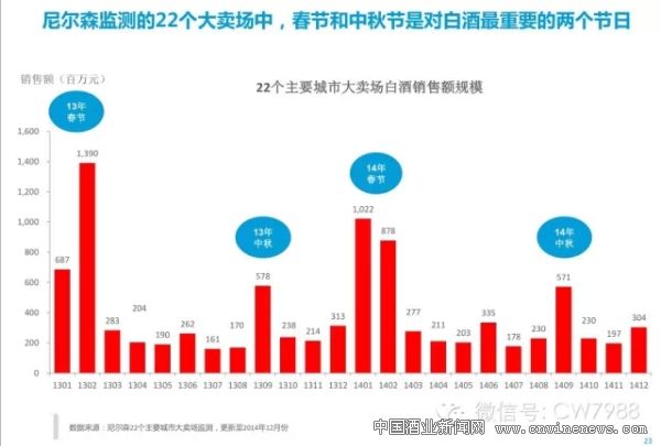 尽管尼尔森对全国22个主要城市的超过1100家卖场的监测显示, 春节和中秋依然是对白酒最重要的两个节日,但相比过去几年,其重要性明显缩水,今年春季和中秋节销售额分别下滑9%和1%。