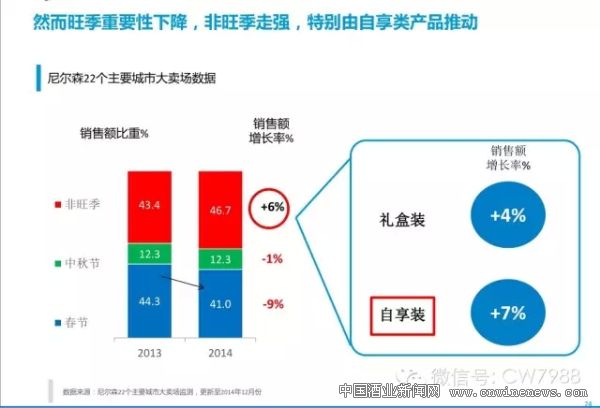 相反,2014年非旺季销售额增长6%,反超节假日。在非旺季的销售中自享装销售(增长7%)相比礼盒装(4%)更具备增长优势。
