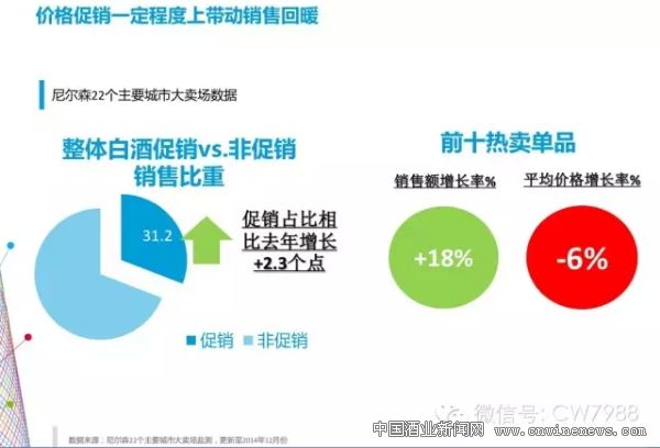 尼尔森的研究显示,2014年,促销带动的销售占整体白酒销售比重31.2%,比2013年增长2.3个百分点,就前十热卖单品而言,平均价格下滑6%,而销售额增长率达到18%。