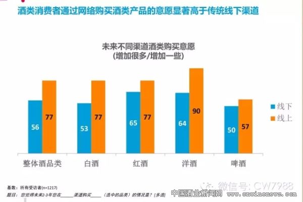 尼尔森的另一份研究报告显示 ,有超过四分之三(77%)的酒类消费者表示在未来的2-3年会通过网络购买酒类产品,其网购意愿显著高于在传统线下渠道(53%)购买白酒。