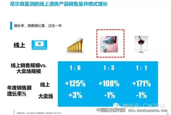 另外,尼尔森的电商数据显示,2014年,白酒线上的销售规模已经达到大卖场的三分之一,且白酒线上销售增长率达到108%。