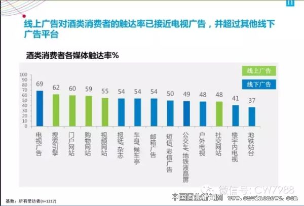 根据尼尔森报告,酒类消费者的线上广告媒体触达率已逐步赶超线下传统媒体,其中搜索引擎(62%)、门户网站(60%)、购物网站(59%)、视频网站(55%)已经成为仅次于电视广告(69%)的最有效媒介平台。如何利用线上平台与消费者进行更加有效的互动和沟通,是白酒厂商在产品推广方面必须要思考的话题。