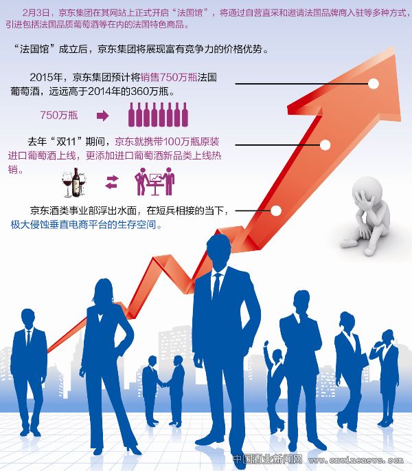 京东方面称,“法国馆”成立后,京东集团将展现富有竞争力的价格优势。2015年,京东集团预计将销售750万瓶法国葡萄酒,远远高于2014年的360万瓶。