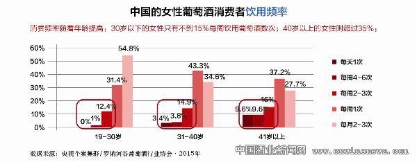数据显示,在中国的东南部地区,女性消费葡萄酒的比例基本都大于60%,同时出具的中国女性消费在不同年龄段消费葡萄酒的比例为18~24岁为42%、25~29岁为55%、30~39岁为69%、40~49岁为59%。