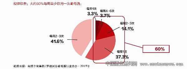 数据还显示,大约60%的中国女性每周至少饮用一次葡萄酒,其中每月饮用2~3次的中国女性消费者占到了41.6%,每天饮用1次的占到3.3%、每周饮用4~6次的占3.7%、每周饮用2~3次的占到14.1%,每周饮用一次的占到37.3%。