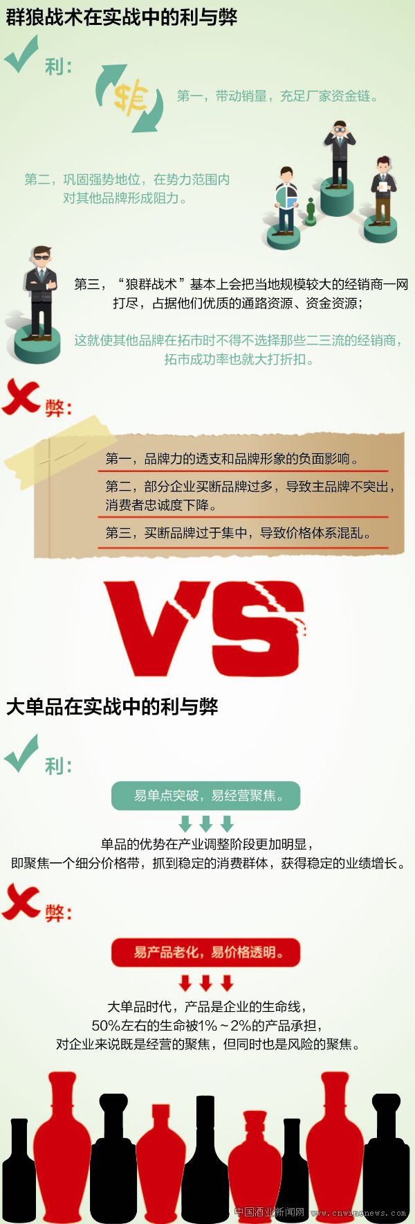 群狼战术渐衰 除了部分奉行大单品战略的企业的带动效应之外,部分采用群狼战术的企业的挫败现实,也导致了酒类企业集体摒弃这种模式。郎酒就被视为一个典型案例——这个多年前依靠群狼战术、多品系战略成功的企业,也同时给自己和经销商造成了极大的负担。