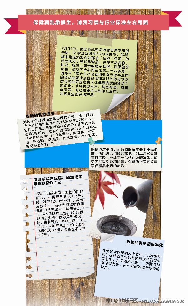 国家食品药品监管总局的一则通告,将诸多保健酒企业涉嫌非法添加化学物质的行为曝光天下,知名企业也涉嫌其中,保健酒行业的隐秘面纱似乎被揭破。诸多人士认为,这个案例对于保健酒行业的负面影响力并不亚于当年酒鬼酒遭逢的“塑化剂事件”。