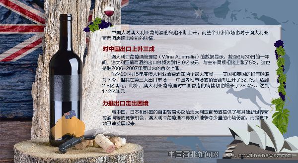 近几年,受中国政府限制“三公”消费的影响,包括葡萄酒、烈酒和名贵手表在内的奢侈品销量锐减。不过最近,中国富裕的中产阶层对于葡萄酒的兴趣重燃,而且对于澳大利亚高端葡萄酒情有独钟。其中一个原因是澳元贬值,另一动力来自于澳大利亚与亚洲的自由贸易协议的签订,使得澳洲酒显出更加良好的性价比。