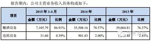 据了解,普瑞特产品中酿酒设备是以不锈钢薄壁容器为核心的液态食品生产设备,占主营业务收入的比重从 2013 年 76.37%增至 2015年 1-4 月的 86.91%,是公司的主要收入来源。