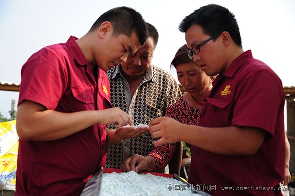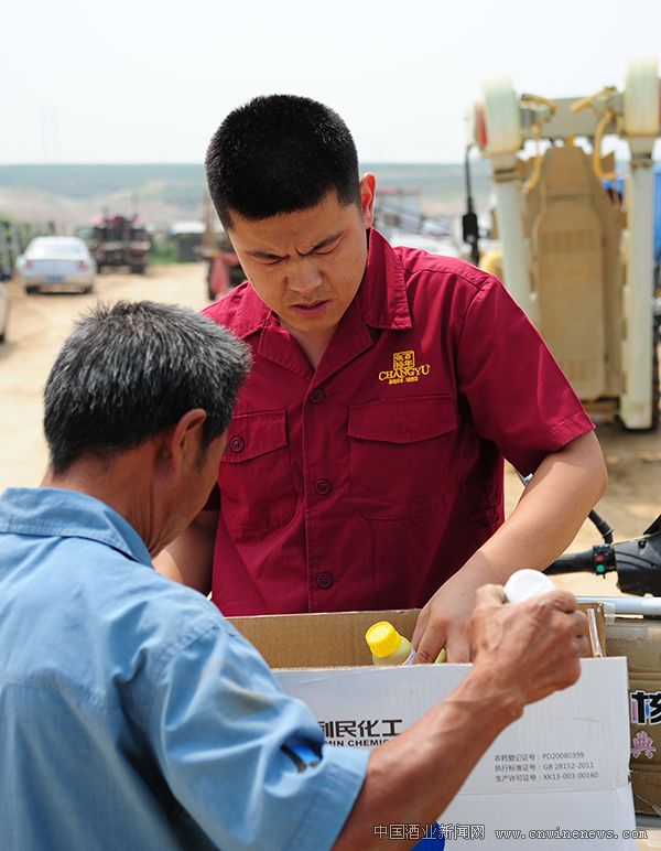 图7:早上6:40,杨亚超为合作农户讲解进口生物制剂的用法。张裕公司提供的农资都是有机生物制剂,能自动降解,保证张裕产品质量安全。