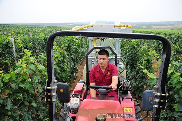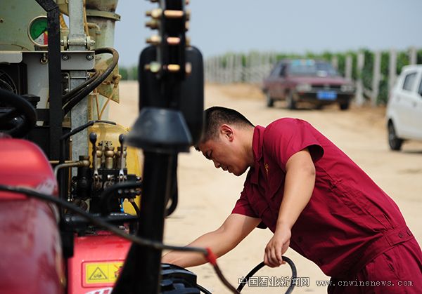 图15:每次用文章来源中国酒业新闻网完机械后,杨亚超都要细心检查保养。张裕公司近年率先引进、推广国外先进的葡萄机械化种植设备,提高葡萄种植效率。