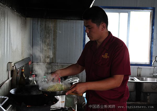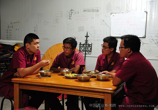 图20:在简陋的活动板房吃晚饭,饭前他要总结葡萄园一天的工作,汇总其他技术员发现的问题,制定解决措施,安排第二天的工作。