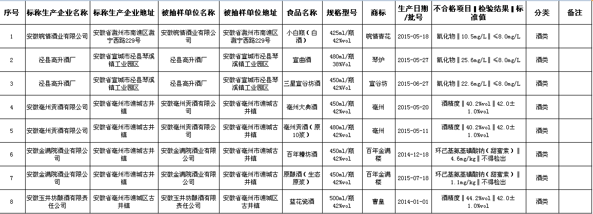 酒类抽检主要包括白酒。抽检项目包括重金属、污染物、食品添加剂及品质指标等指标。不合格项目为氰化物、甜蜜素、酒精度。以下是不合格产品信息。