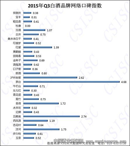 中国统计信息服务中心大数据研究实验室基于自身研发的大数据监测系统和数据挖掘技术,以第三视角从白酒市场中筛选出30个各方面比较突出的白酒品牌作为研究对象,综合运用网媒、电商、论坛等网络数据,通过多方面多指标对白酒品牌进行品牌口碑指数评价,并最终形成当期2015年第三季度《中国白酒品牌口碑研究报告》(以下简称《报告》)。