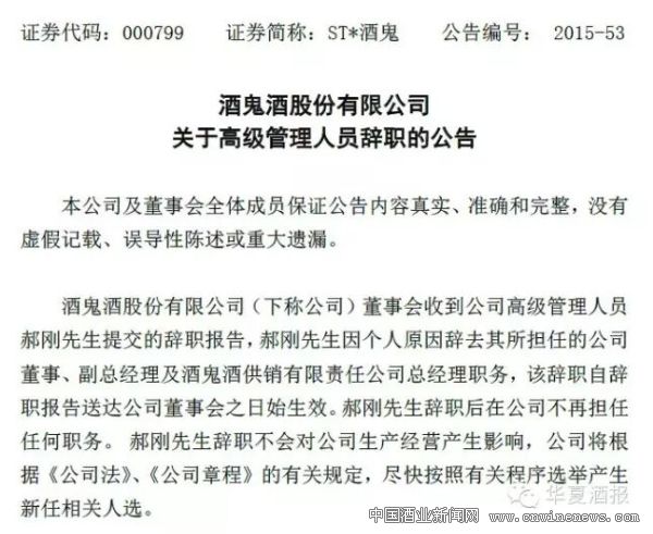 12月14日晚间,ST*酒鬼发布公告称,公司董事会收到公司高管郝刚提交的辞职文章来源中国酒业新闻网报告,郝刚因个人原因辞去其所担任的公司董事、副总经理及酒鬼酒供销有限责任公司总经理职务。