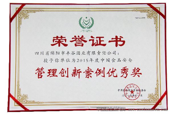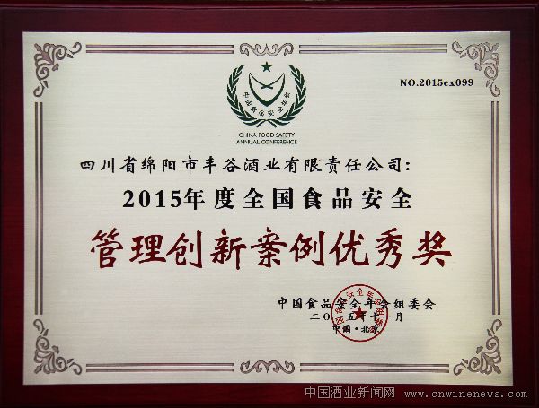 在本届大会中,丰谷酒业荣获“管理创新案例优秀奖”, 检测分析部经理郑敏荣获“2015年全国食品安全优秀管理者”称号。