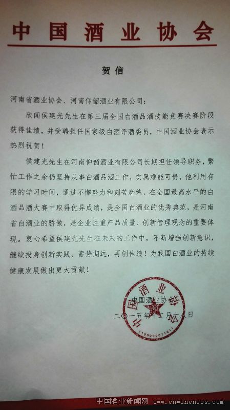 “全国白酒品酒职业技能竞赛”是中国白酒品评的最高专业水准的大赛,每五年进行一次换届考试,旨在选拔出更多专业优秀人才。12月16日,中国酒业协会公布了2015届国家级白酒评酒委员名单,仰韶酒业侯建光、韩素娜、冯春红、杨国强四位同志被聘任为“2015届国家级白酒评酒委员”。