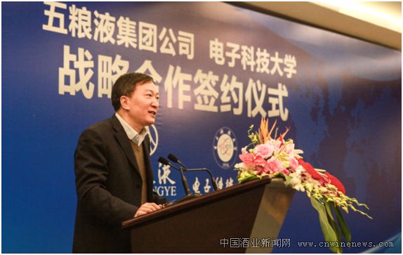 五粮液集团公司董事长唐桥在致辞时表示,“互联网+”是经济新常态下,转变经济发展方式、促进产业转型升级的重要抓手。此次五粮液与电子科大合作,正是顺应时代发展,以“互联网+”和“工业4.0”的创新成果,推动传统酿酒产业实现转型升级而做出的战略选择。