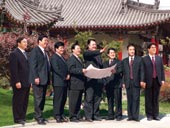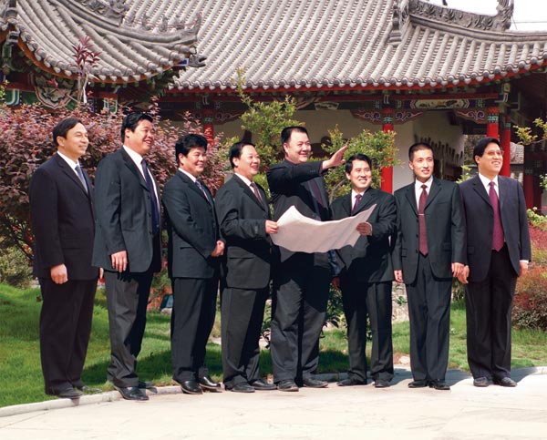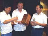 太白董事长张吉焕(中)、总经理张智斌(右一)与西安微得利公司总经理刘小军研究20年洞藏太白酒的包装。